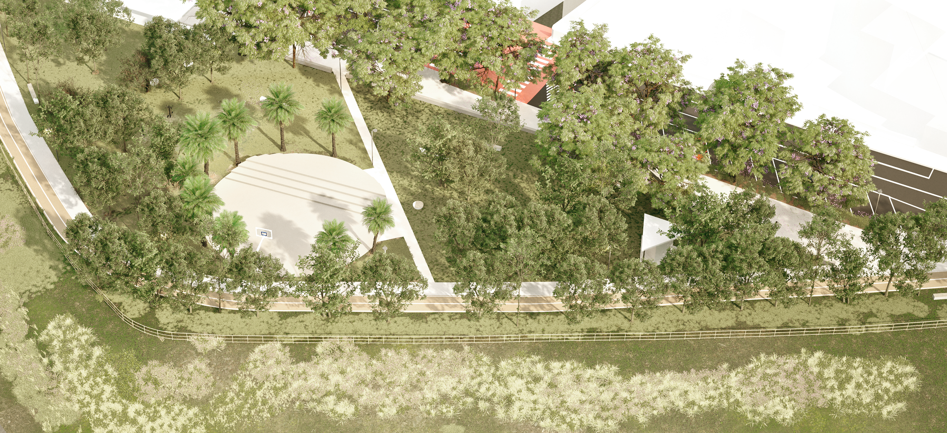 Come da buona norma, l’intero disegno dei percorsi e delle aree piantumate risponde con attenzione anche a tutte le prescrizioni che ricadono sull’area vista la stretta vicinanza al Rio e in particolare alla perimetrazione PAI e a quanto stabilito dal Genio Civile e dal R.D. 523/1904. L’art.96, lettera f, di tale norma, in particolare, vieta la piantumazione di alberi e siepi e il movimento del terreno ad una distanza inferiore a 4 m dal piede dell’argine di un fiume e vieta gli scavi e la realizzazione di qualsiasi opera entro i 10 m dallo stesso piede. Pertanto il disegno del nuovo parco lascia libera tutta la fascia lungo il rio e lungo la golena per le distanze prescritte dalla norma, concentrando la realizzazione del nuovo paesaggio del parco sul fronte strada, in diretta vicinanza con la città. Analogamente, data la presenza della perimetrazione PAI in Hi4, la realizzazione dei nuovi percorsi e spazi attrezzati è stata organizzata nel lotto in modo da non ricadere su tale perimetrazione, nel rispetto del carattere dei luoghi e delle normative in materia.
